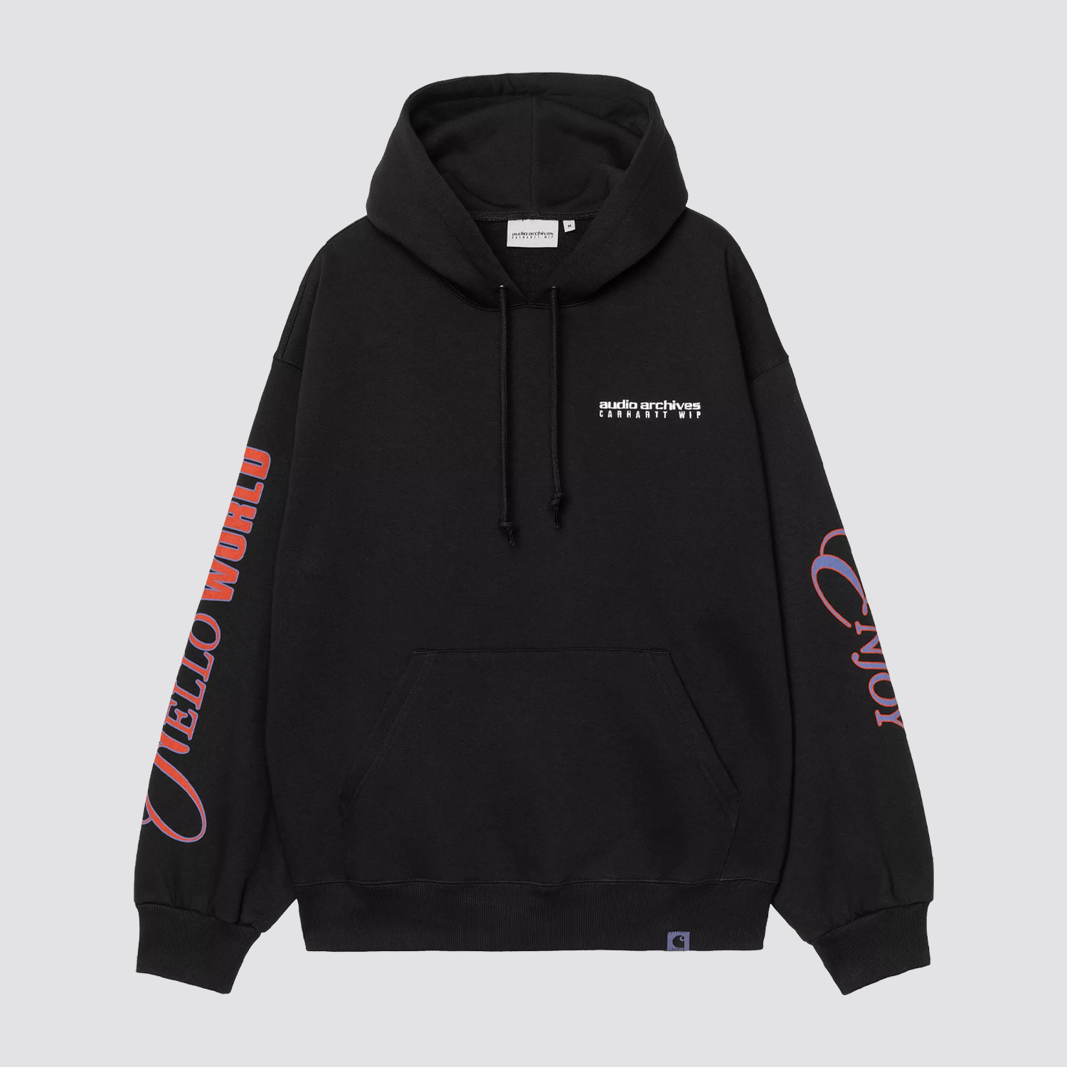 Audio Archives marks over 15 years of Carhartt WIP Radio, celebrating independent artists and labels, while honoring the deepening cultural impact of community radio today. The Audio Archives WIP Hooded Sweatshirt is made in a loose fit from a heavyweight polycotton jersey with a brushed, fleece-like backing. Graphic prints appear on the front, back and sleeves. A Carhartt WIP Radio Square Label appears on the bottom hem.